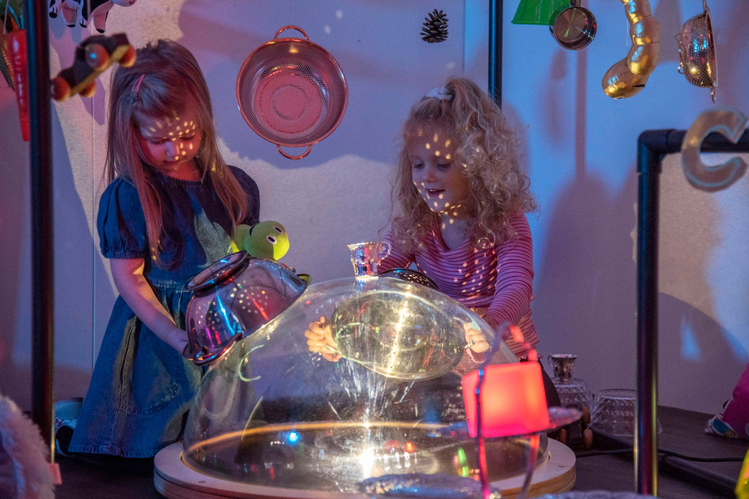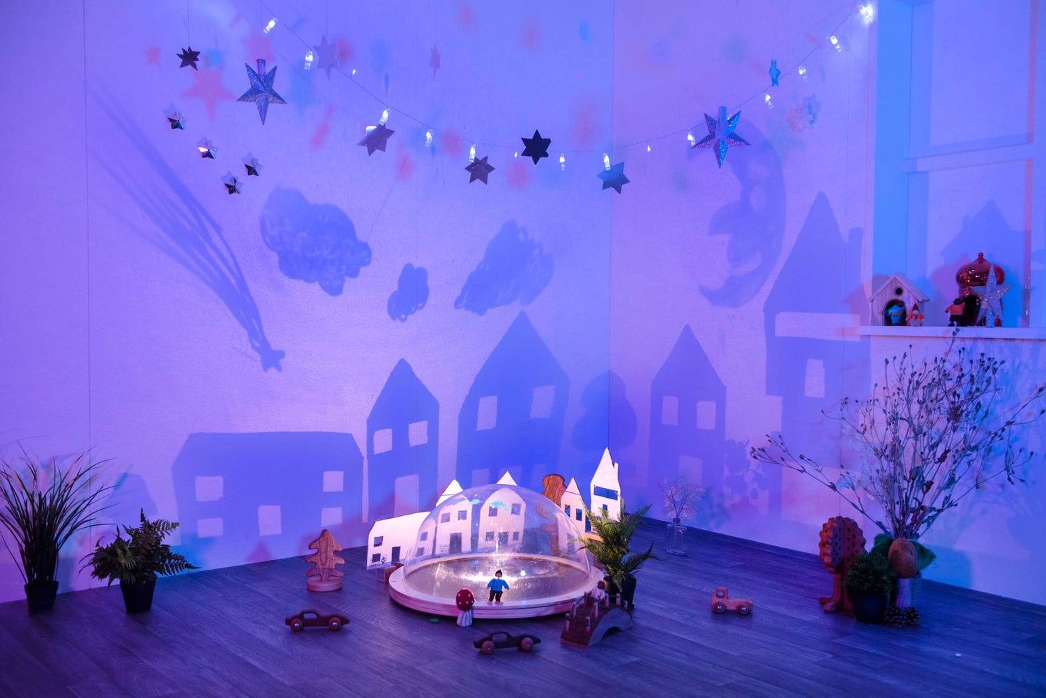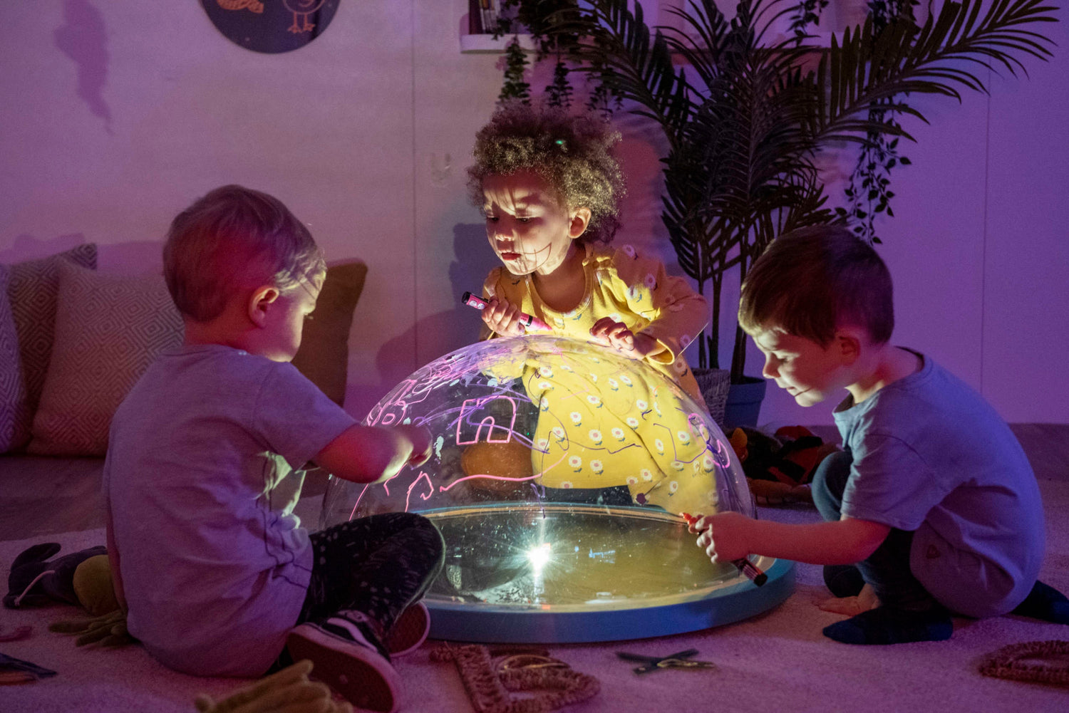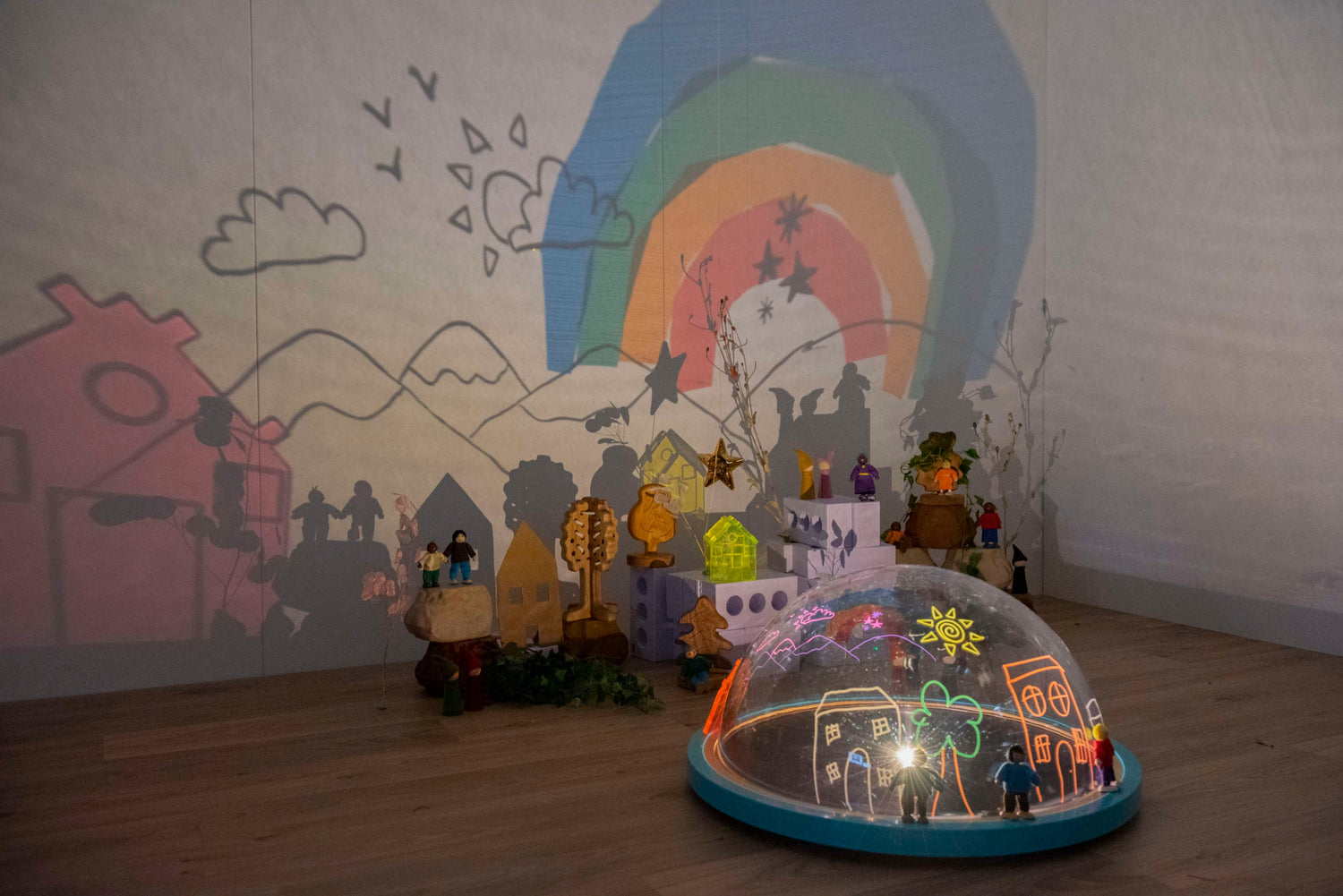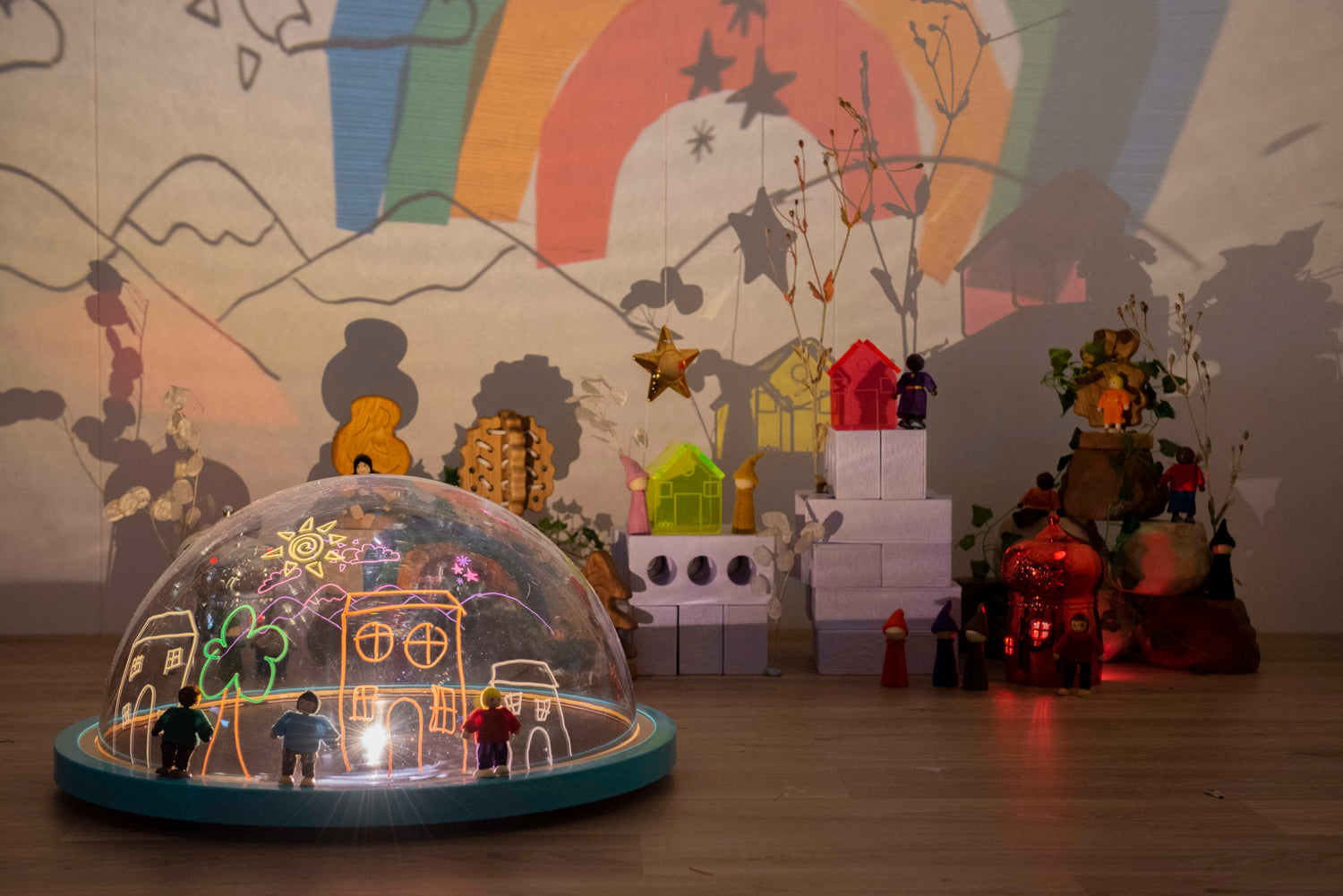 Bērni var kupolam pievienot brīvas daļas, mazu pasaules tēlus, audumus vai caurspīdīgas figūras. Viņi var arī zīmēt uz virsmas ar piemērotiem instrumentiem, lai mainītu projekciju.