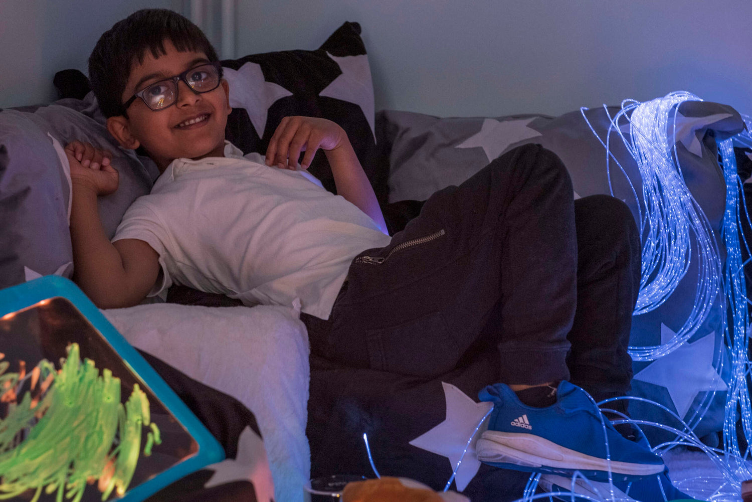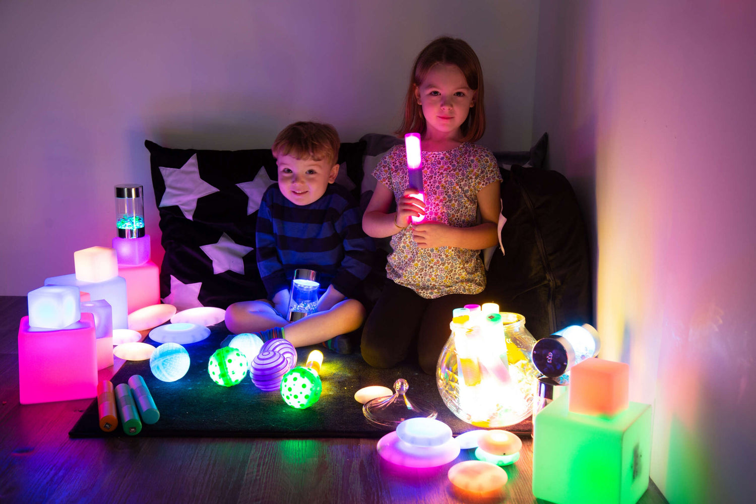 TTS tumsā spīdošie spilveni, 2 gab. – melni, divpusēji mīksti grīdas spilveni, paredzēti izmantošanai sensorajā istabā, nomierināšanās zonā un lasīšanas stūrītī. Pēc uzlādes gaismā zvaigžņotā puse sāk spīdēt tumsā un nodrošina maigu vizuālo fokusu. Otra puse ir vienkrāsaina, ja audzēknim nepieciešams mazāk stimulu. Iekšpusē ir augsta blīvuma putas, kas nodrošina atbalstu sēdēšanai un atpūtas brīžiem. Noņemams pārvalks ir mazgājams 30 grādu temperatūrā.