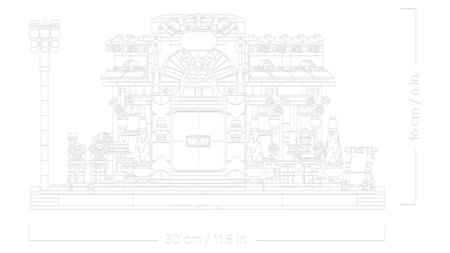 • Izmēri — 1101 detaļas Franču kafejnīcas ēkas izmēri ir vairāk nekā 16 cm (6 collas) augstums, 30 cm (11 collas) platums un 6 cm (2 collas) dziļums.