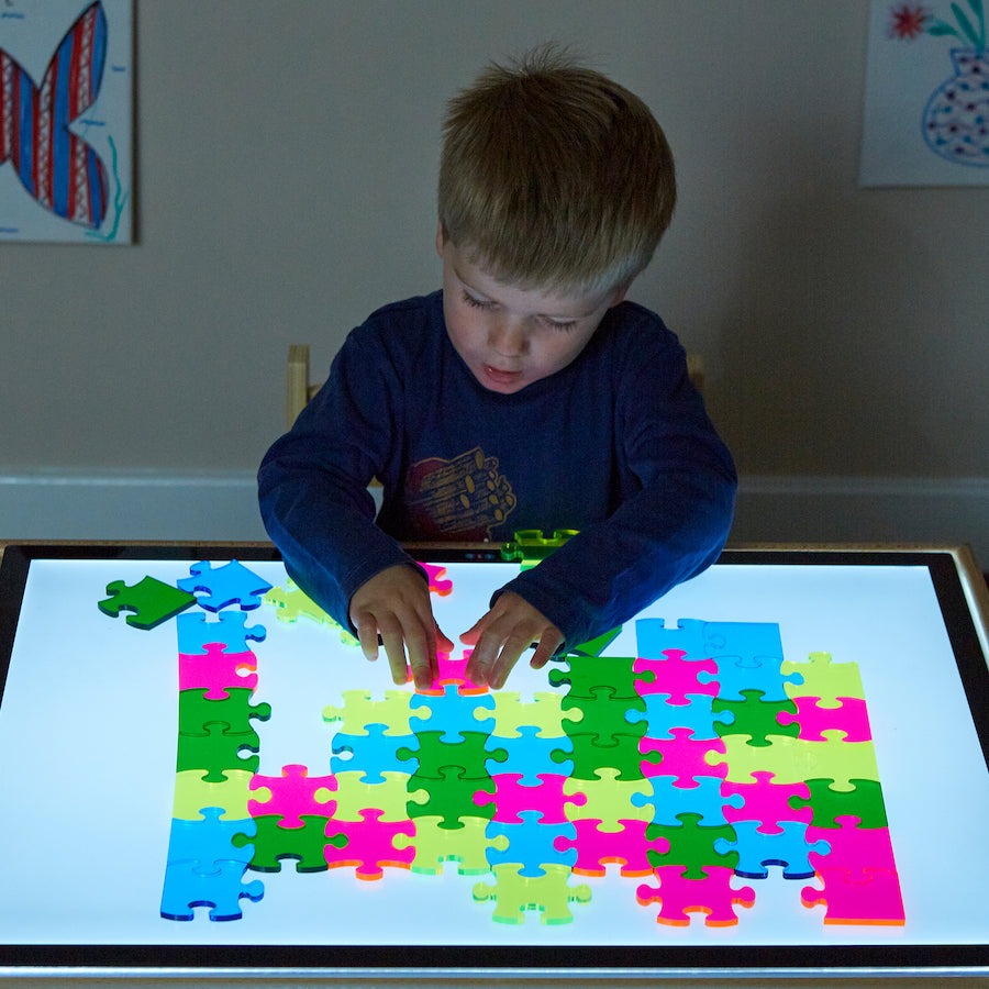 Lielisks aksesuārs gaismas paneļu aktivitātēm. Bērni var eksperimentēt un izpētīt, kā detaļas sader kopā. Gaisma, kas spīd cauri akrila paneļiem, pastiprina iesaisti. Pamēģiniet paneļa augšpusē pievienot dažādas acetāta loksnes, lai radītu dažādus efektus. Biezās detaļas ir ideāli piemērotas mazām rociņām. Lielisks veids, kā pievienot sensoru elementu rakstiem un secībai.
