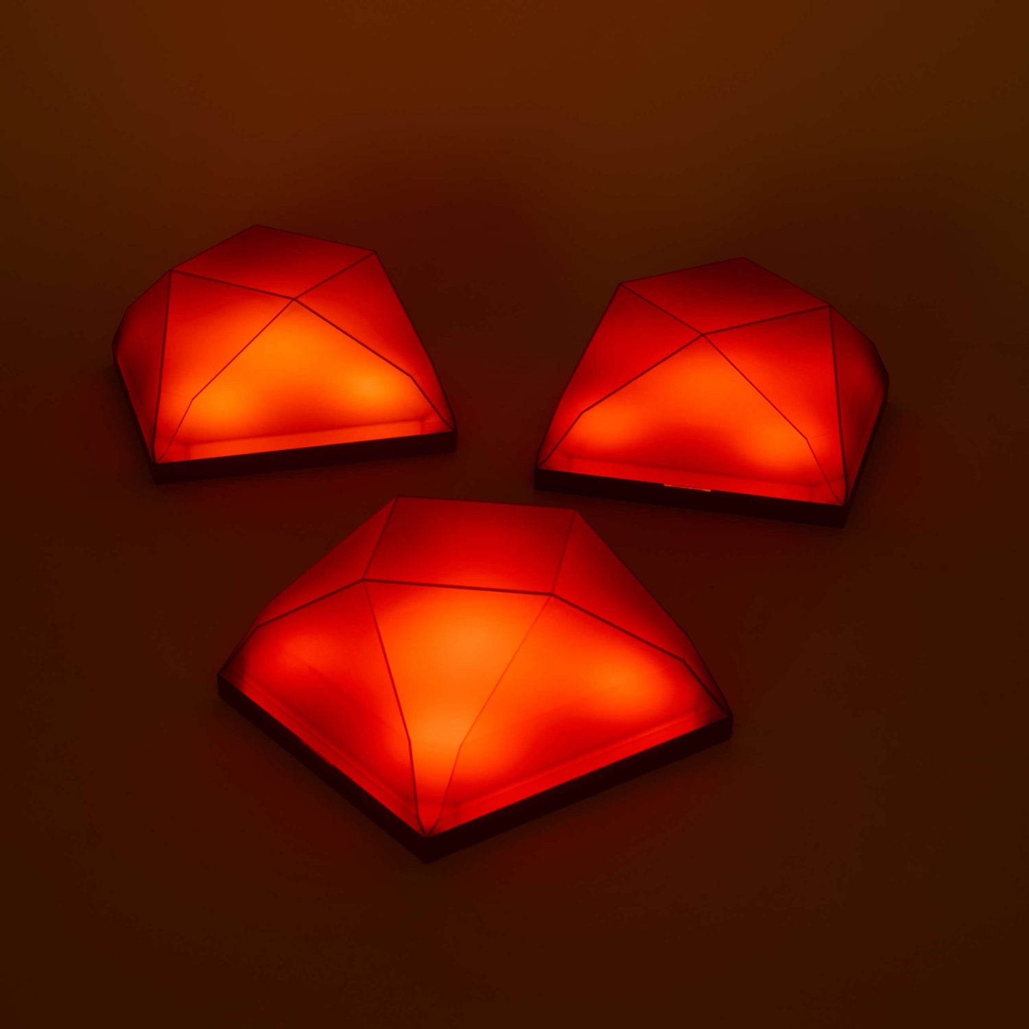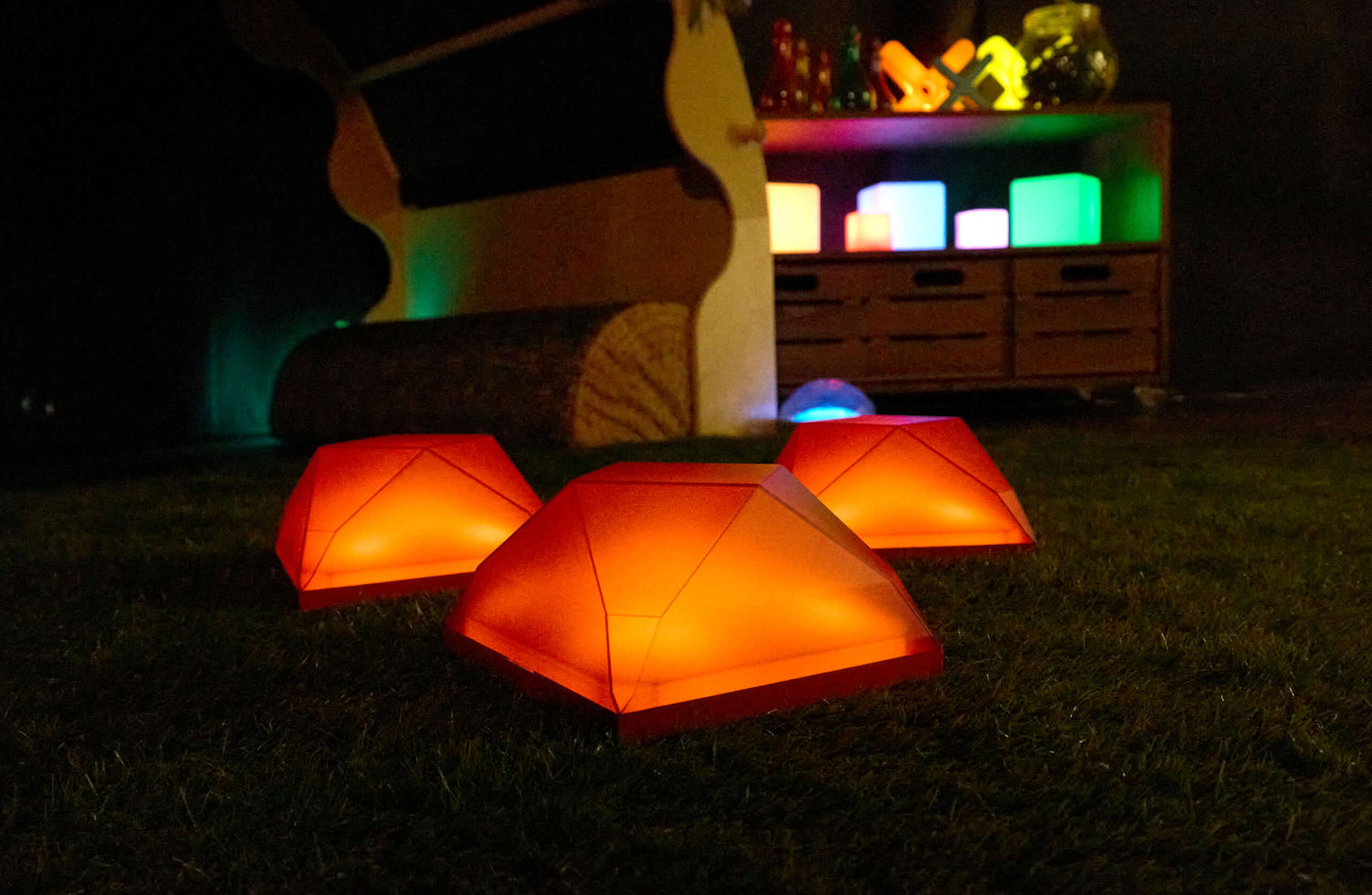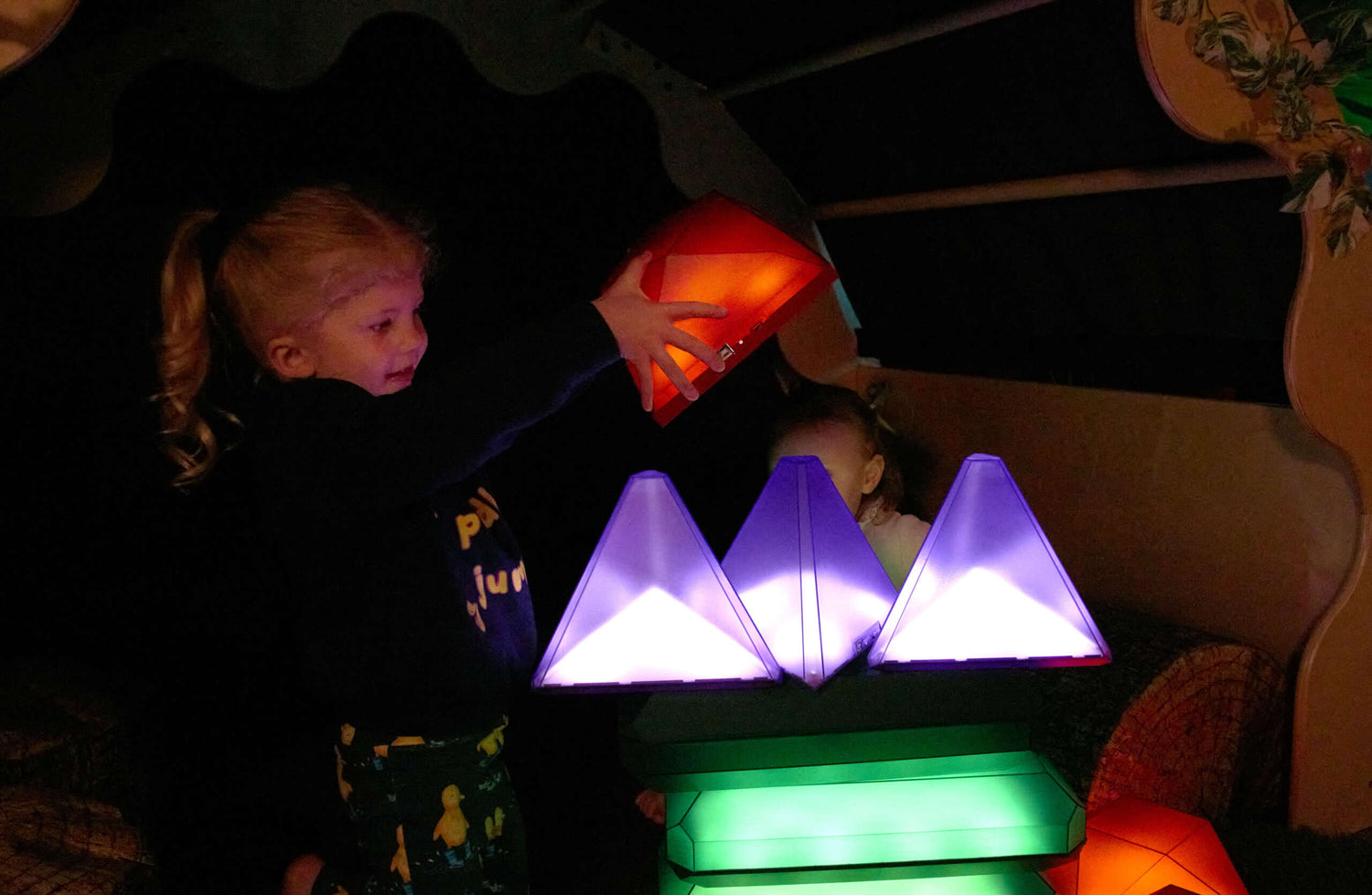 Gaismas kvadrāti atklātajām daļām piešķir skaidru formu un gaismas fokusu un atbalsta agrīnās matemātikas prasmes.