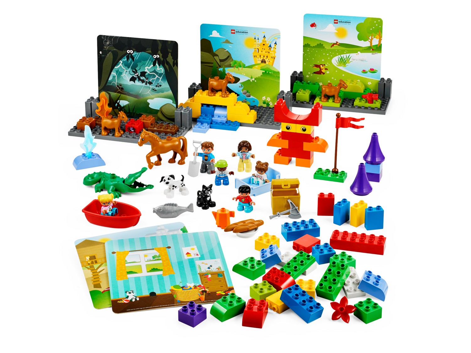 LEGO Education DUPLO stāstnieka komplekts attīsta radošumu, iztēli, stāstīšanas prasmes un valodas prasmes. Komplektā ietilpst 3 pamatnes un 5 divpusējas stāsta sākuma kartītes un 109 klucīši.