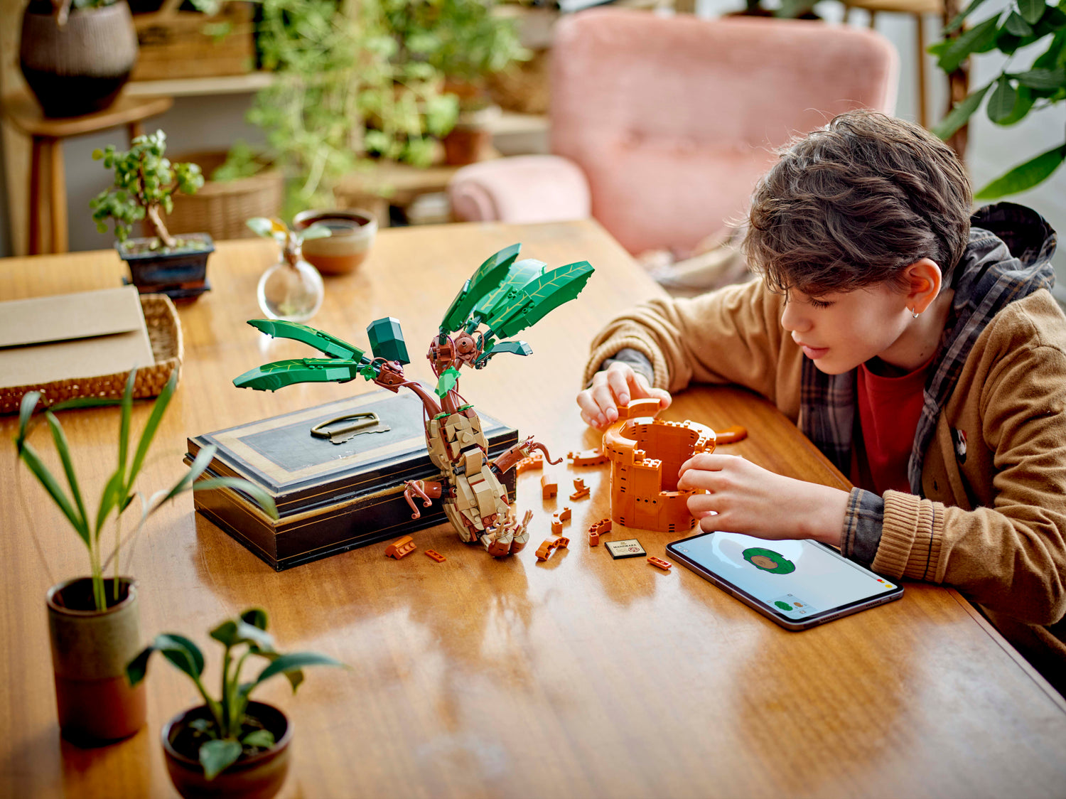 Radi rotaļīgu izstādi ar maģisko raganas saknes augu LEGO Harija Potera rotaļu figūru no Cūkkārpas pils zāļu zinību nodarbības.