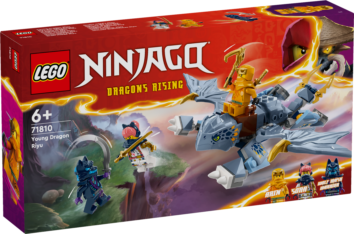 LEGO NINJAGO darbības rotaļlieta ar kustīgu jaunā pūķa Riju modeli un NINJAGO minifigūrām Soru, Arinu un vilka maskēto karotāju.