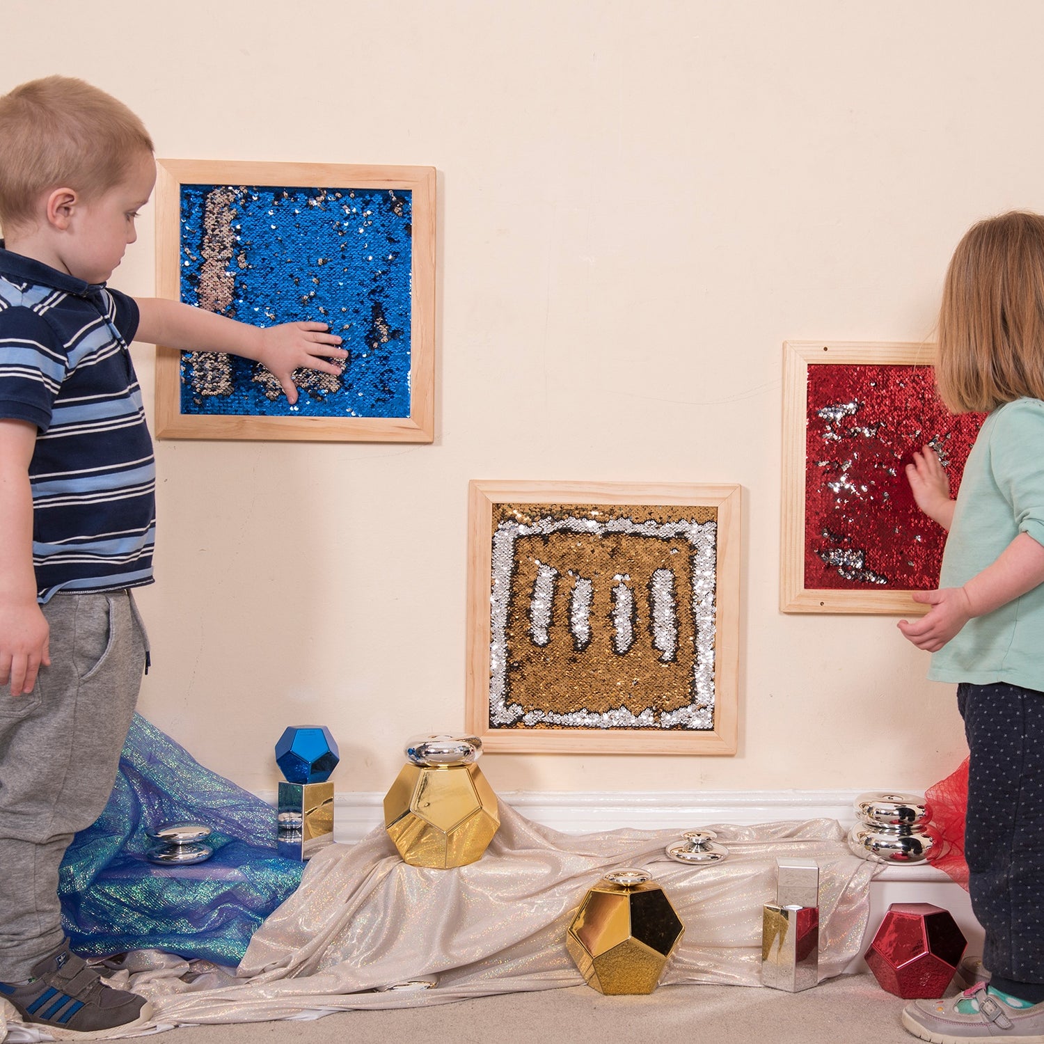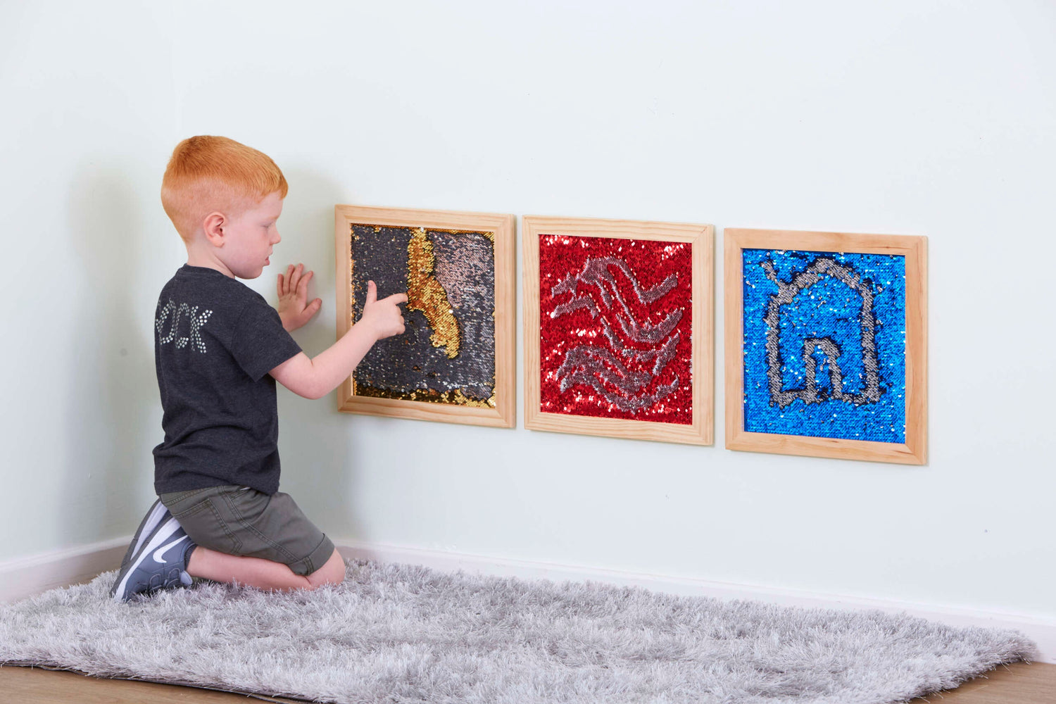 Komplekts satur: 3 smalkās motorikas sienas paneļus ar spīdumiem dažādās krāsās.