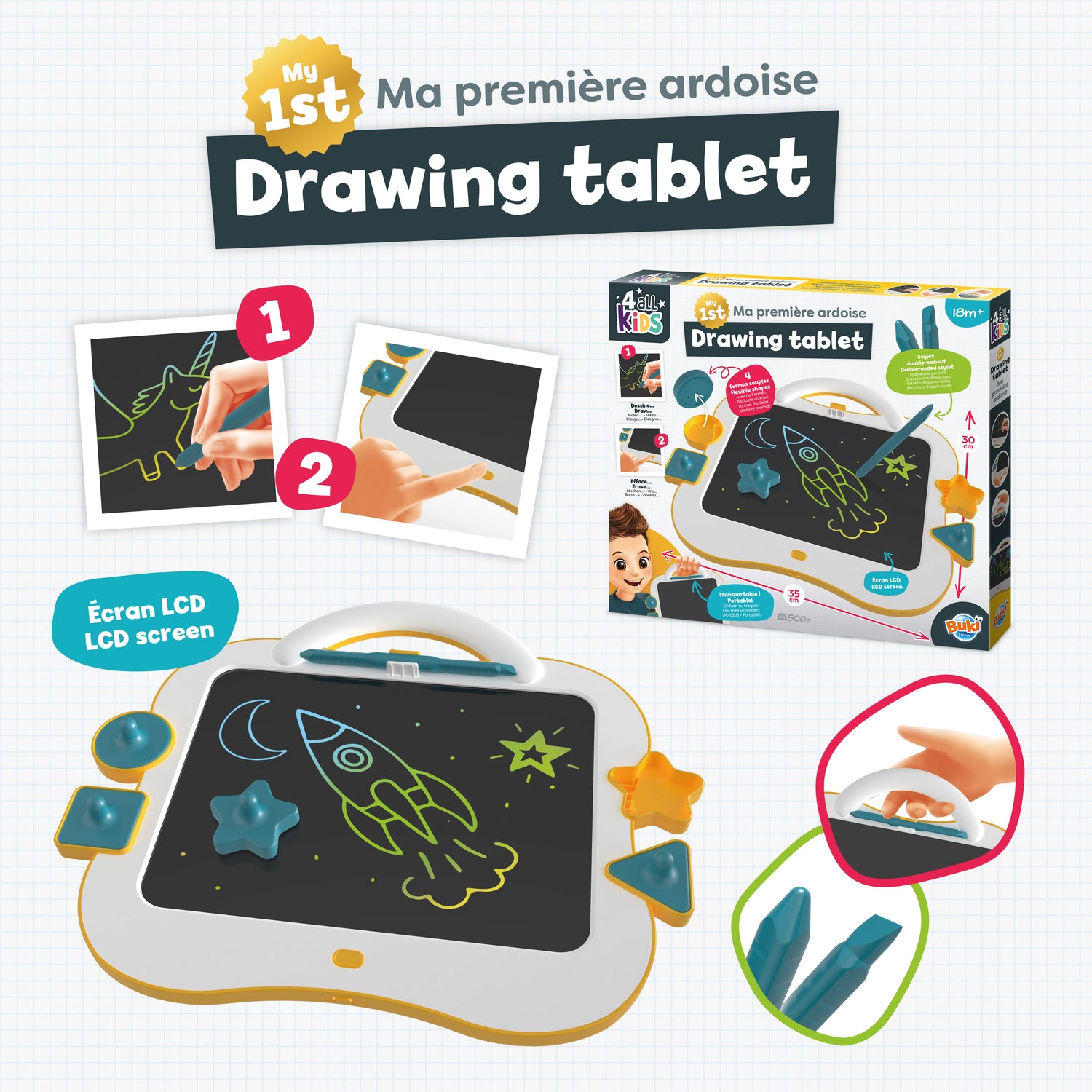 Liels un viegls planšetdators ar viena pieskāriena dzēšanas un bloķēšanas slēdzi atvieglo radošu vingrinājumu veikšanu mājās un ceļā.