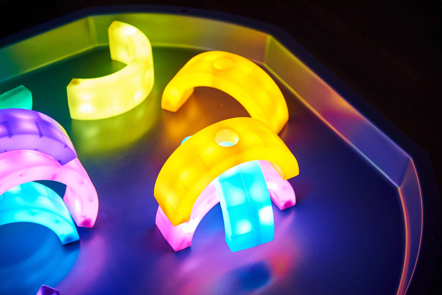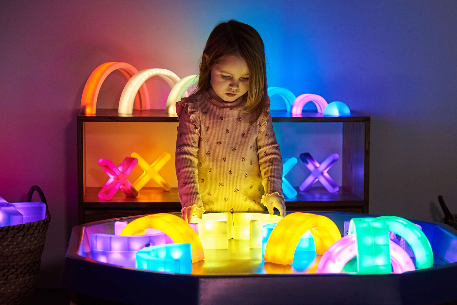 TTS gaismas loki, 12 gab. ir uzlādējami loki ar atvērumiem, kas iedegas, nospiežot pogu. Bērni tos var salikt kaudzē, līdzsvarot un kombinēt ar citām vaļīgām daļām atvērtām būvniecības spēlēm. Krāsas atbalsta šķirošanu un rakstu veidošanu agrīnajā matemātikā. Piemērots bērnudārziem un pirmsskolas izglītībai no 10 mēnešu vecuma.