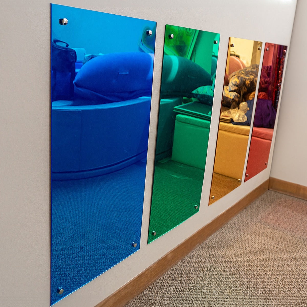 Liels krāsains sarkans akrila spogulis, kas atbalsta spoguļu spēli un gaismas izpēti.