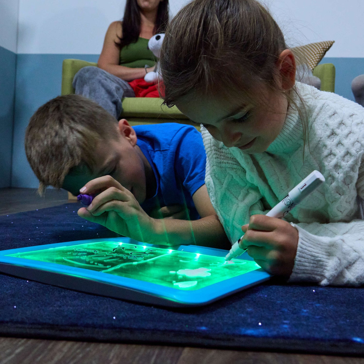 TTS A4 izgaismots zīmēšanas un rakstīšanas planšetdators ar 6 marķieriem padara rakstīšanu un zīmēšanu vizuāli skaidru. Izvēlieties starp 7 LED fona apgaismojuma krāsām vai izmantojiet automātisko krāsu maiņu. Gludā virsma ir piemērota krīta marķieriem un to var notīrīt ar mitru drānu. Piemērots bērnudārzu un sākumskolu mācību līdzeklis, īpaši sajūtu telpā un iekļaujošās izglītības aktivitātēs.