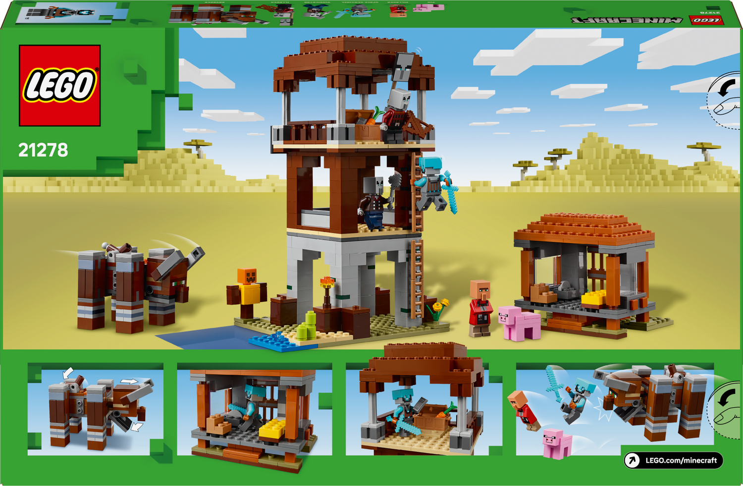 LEGO® Minecraft® Rüüstajate eelpost ja Laastaja annab Minecrafti mängijate kättesse peaga rammiva ja lõugadega haarava laastaja.