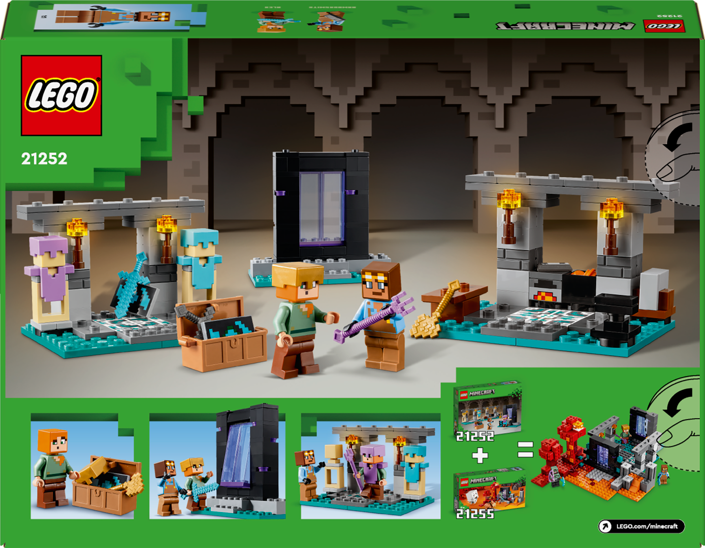 Šajā funkcijām bagātajā praktiskajā rotaļlietā spēlētāji kopā ar LEGO® Minecraft® Aleksu un čaklo ieroču kalēju izgatavo bruņas un ieročus.