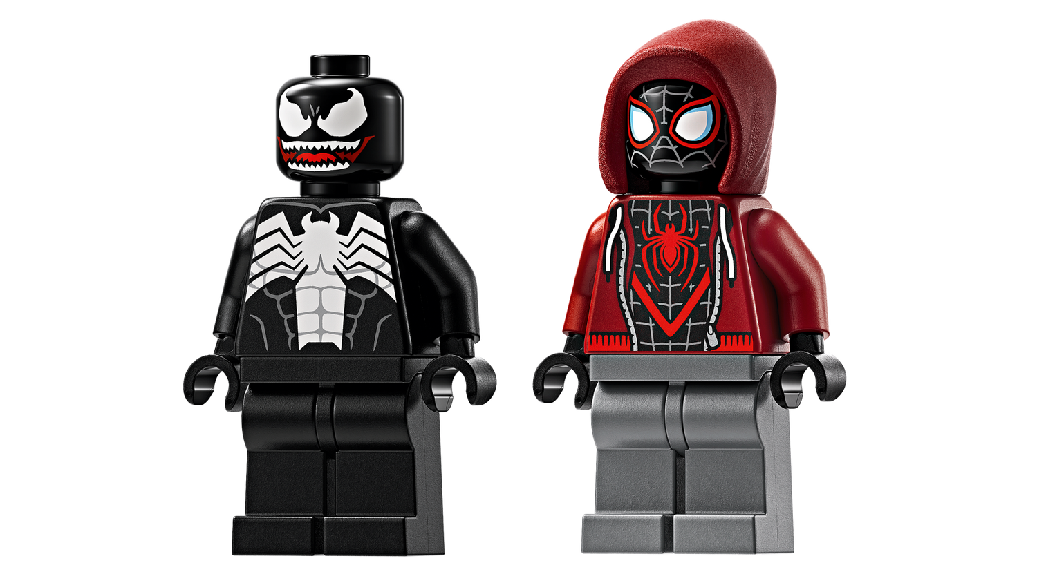 Ar tīkliem vicinošs, šūpojošs supervaroņa piedzīvojums ar pilnībā artikulētu, saliekamu Venom robota rotaļlietu un Mailsa Moralesa un Venom minifigūrām.