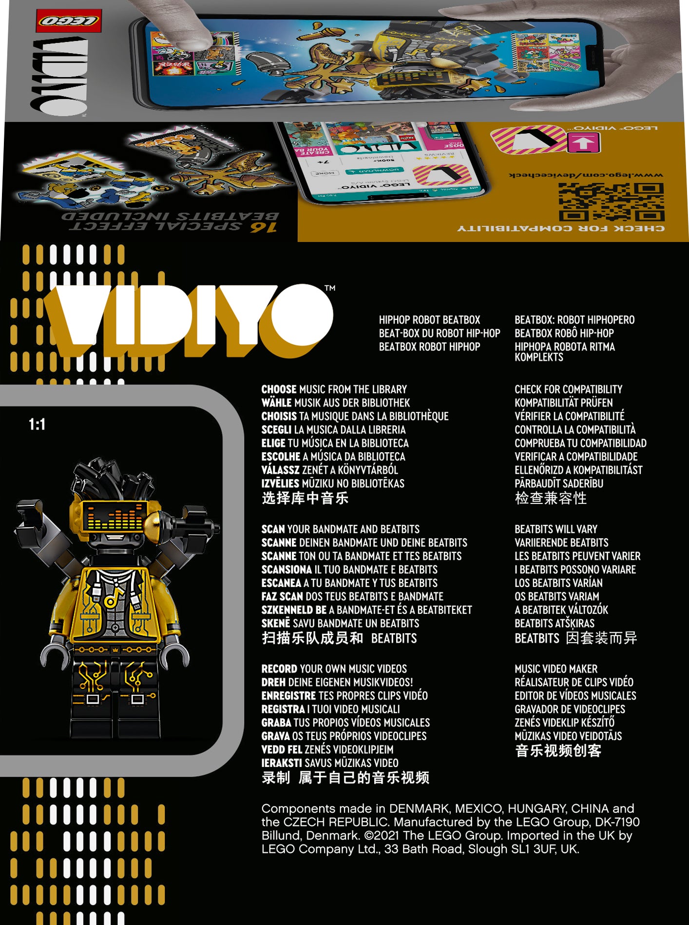 • Vērojiet, kā bērni režisē un filmējas savos mūzikas videoklipos ar LEGO® VIDIYO™ HipHop Robot BeatBox (43107). Iekļauta robota minifigūra, mikrofons, 14 nejauši BeatBits un divi īpaši BeatBits. • Lejupielādējiet bezmaksas LEGO® VIDIYO™ lietotni, lai skenētu minifigūru un īpašos efektus BeatBite. Bērniem patiks vērot, kā viņu varonis atdzīvojas hiphopa mūzikas videoklipā. • Skenējiet BeatBite lietotnē, lai atbloķētu īpašos efektus, piemēram, mirdzuma filtru, kas visu padara melnbaltu, izņemot minifigūras, kuras kļūst zeltainas. • Lielisks muzikāls risinājums zēnam vai meitenei no 7 gadu vecuma, kuri ir pelnījuši atlīdzību. Šis rotaļu komplekts ir arī lieliska svētku dāvana bērnam, kuram patīk muzikālas rotaļlietas, dejošana un uzstāšanās. • BeatBox izmēri ir vairāk nekā 8 cm (3 collas) augsts, 7 cm (2 collas) garš un 10 cm (4 collas) plats. • BeatBox var salocīt, lai bērni varētu ņemt savu muzikālo pasauli līdzi, lai kur viņi dotos. BeatBox ir vieta no klucīšiem būvētai skatuvei, 16 BeatBits un robota mikrofonam. • LEGO® VIDIYO™ lietotne ir saderīga ar izvēlētām iOS un Android ierīcēm. Informāciju par saderību skatiet vietnē www.LEGO.com/devicecheck. Bērniem jālūdz vecākiem atļauja izmantot internetu. • LEGO® VIDIYO™ komplekti piedāvā jaunu sociālo rotaļu pieredzi, kur zēni un meitenes var būt režisori, producenti un mūzikas zvaigznes, režisējot un kopīgojot savus mūzikas videoklipus. • LEGO® detaļas atbilst stingriem nozares standartiem, lai katru reizi nodrošinātu nemainīgu kvalitāti, saderību un drošu savienojumu. Tā tas ir bijis kopš 1958. gada. • LEGO® detaļas tiek mestas, karsētas, spiestas, savītas un analizētas. Tāpēc jūs varat būt pārliecināti, ka tās atbilst stingriem globālajiem drošības standartiem.