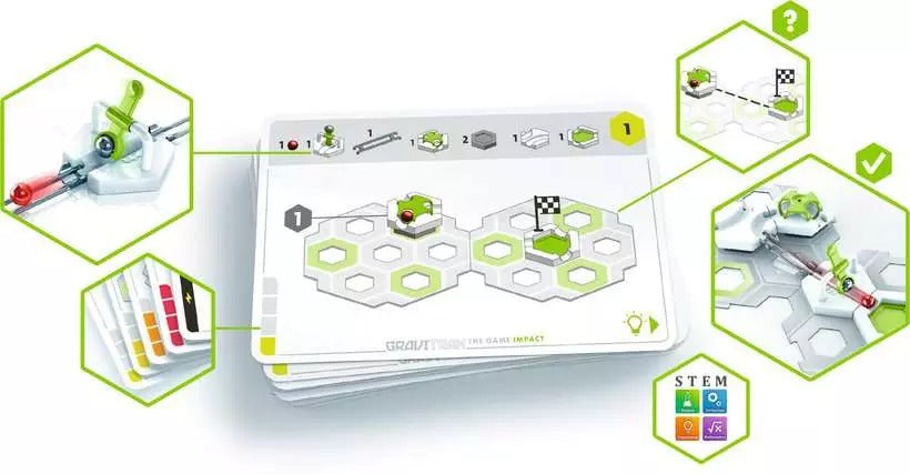 GraviTrax galda spēle piedāvā jautras mīklas un izaicinājumus, kas pakāpeniski palielinās sarežģītības pakāpē.